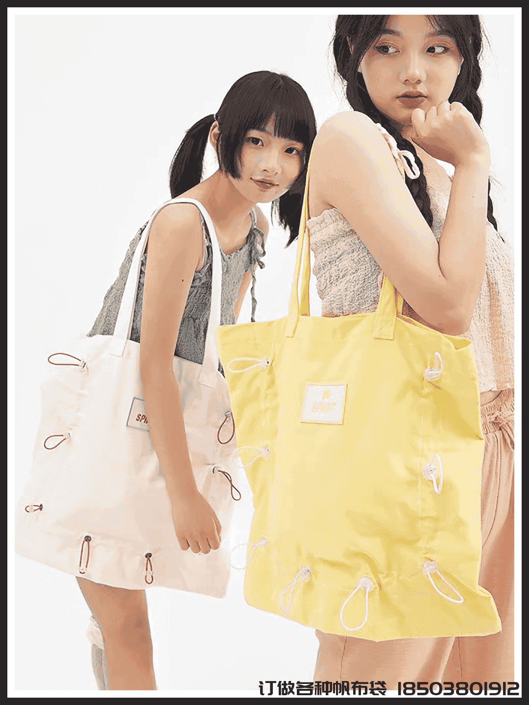 而這款褶皺帆布包容量大,前面的抽松緊設(shè)計讓包包更有型,中間的簡單可愛的圖案是魔術(shù)貼的設(shè)計,可以替換的