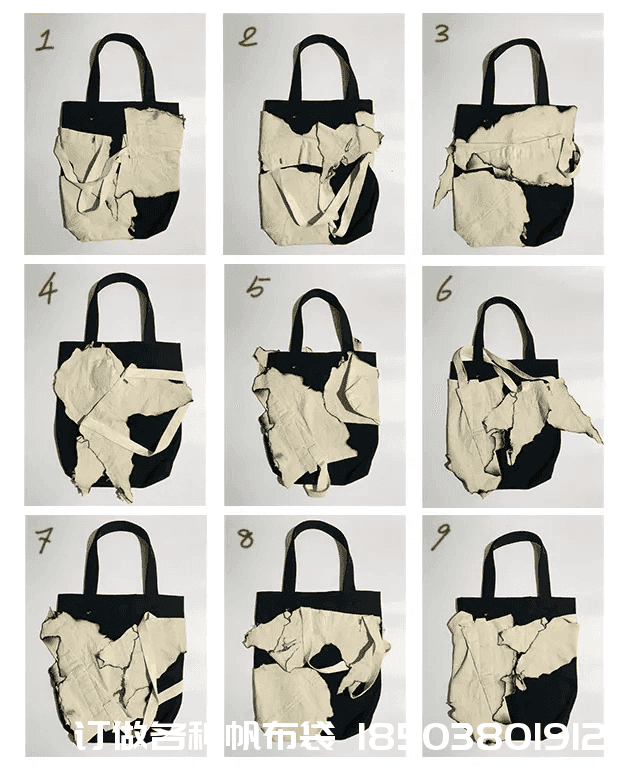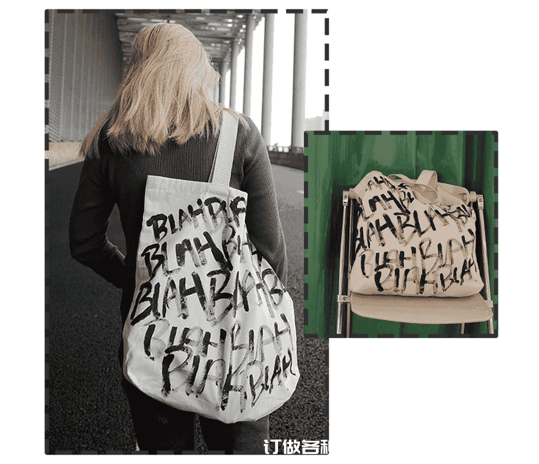 每一只包包都運用了高難度手工制作方法,所以基本上每一款包袋都花了很多心思去制作。像這款#BLAH帆布禮品袋帆布袋制作電話/微信:15838231350不規(guī)則黑白字母帆布袋,上面的有態(tài)度文字完全是手工刷染的