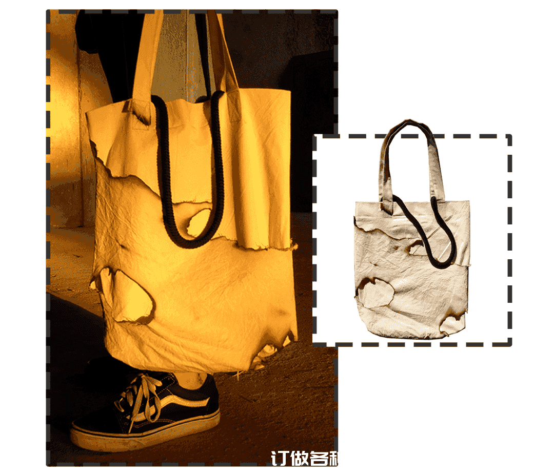 最讓我覺得驚艷的還是它家手工灼燒帆布袋系列,帆布上有被燒灼留下的不規(guī)則破洞,包袋上的紋理效果均為隨機產(chǎn)生
