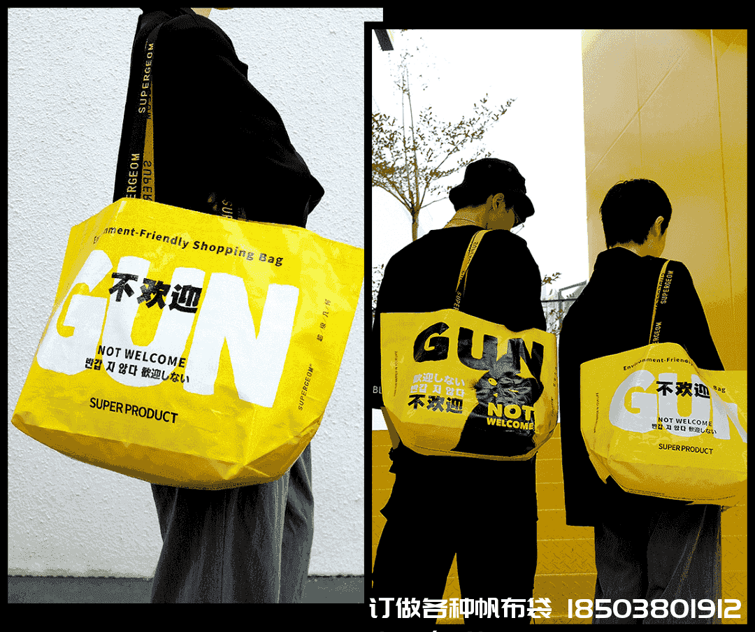 我一眼就相中了超級幾何額環(huán)保編織購物袋(不是帆布袋),拽拽得很有態(tài)度的文字,一面是「不歡迎」,另外一面是「GUN」,可手提可斜挎
