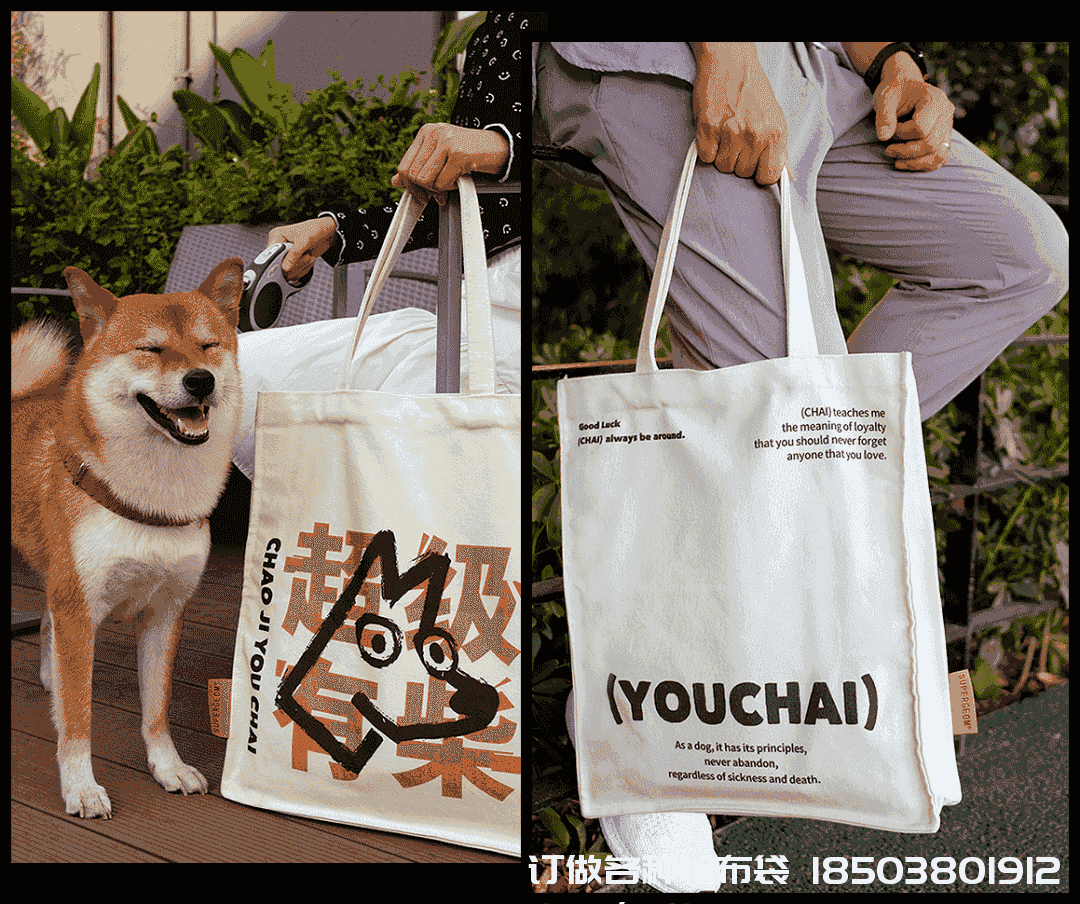 「超級有柴」阿柴狗頭可可愛愛的,簡單幾筆就非常形象,紅黑搭配帆布禮品袋帆布袋制作電話/微信:15838231350加泛黃的帆布感覺設(shè)計很特別