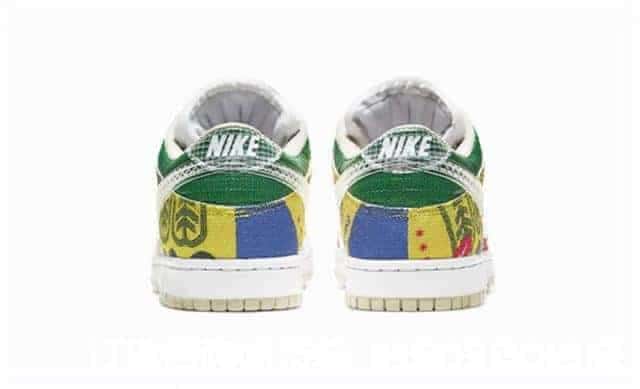 整雙鞋第一印象就是色彩方面上的大膽運用,紅、綠、藍、白、棕、黃多種顏色的巧妙融合給人過目不忘的視覺感受。蟬翼、織物、帆布等不同材質打造的鞋面,帶來十足的層次感,辨識度一流。同時Nike以及Dunk等相關的圖像文字元素穿插在鞋身,細節滿滿。
