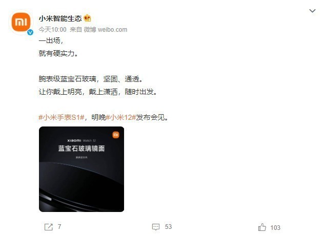 今天,小米宣布將會在小米12系列發布會上推出智能手表S1,它采用腕表級藍寶石玻璃,擁有“腕表般”的驚艷。