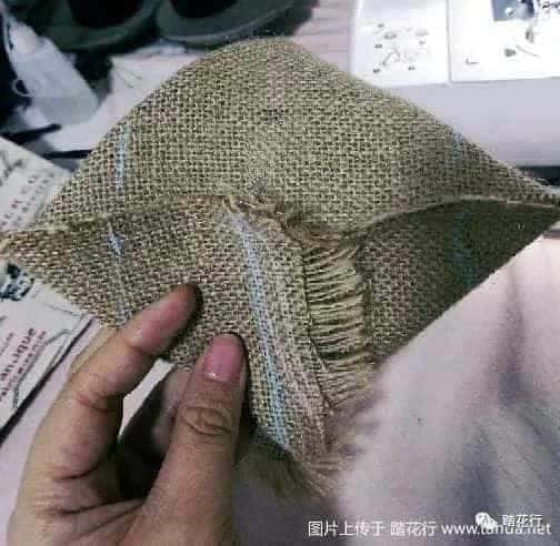 隨便找塊廢布料,卷起來做成繩子,剪下來大概6厘米左右的長度,如下圖,放置在雙層布袋的里層,然后縫上,這里要特別注意,一定要把兩層都縫上,為了牢固起見,可以多走兩趟線,