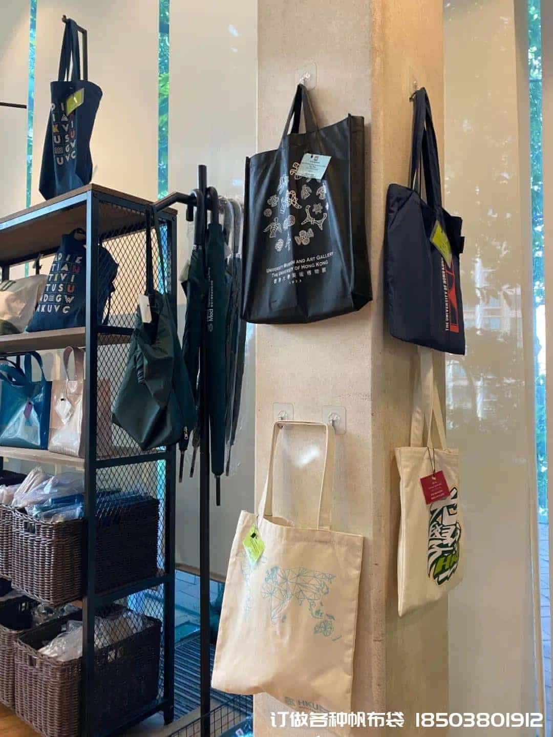 香港某大學紀念品商店的棉布袋,其中的大型彩色文字膠質印花極有可能是PVC制品 (本刊記者莊紓攝)