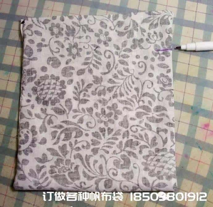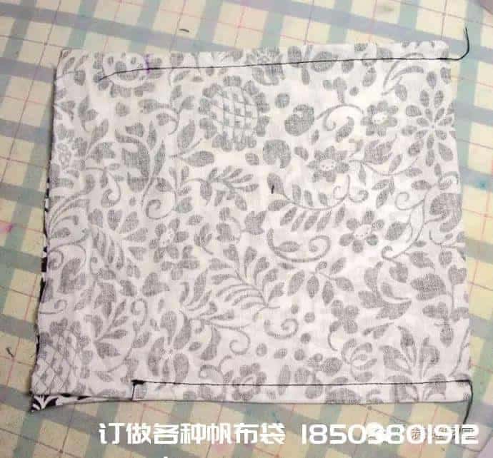 對折后在距布邊4.5CM(小款)或5CM(大款)處用水消筆做標記。從對折處到做標記處,沿線縫合,要注意此處縫頭要盡量小點,好在返過來再縫后不會露出線頭或布邊。