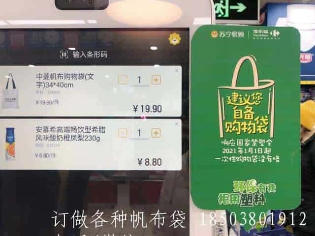 那么,買了一大堆東西卻沒帶購物袋的消費者怎么辦?家樂福中山公園店收銀員介紹,超市目前提供免費的紙袋,消費者也可以購買環保袋,價格在幾元至十幾元之間不等。記者注意到,在自助收銀機下方看到掛有一個帆布購物袋,掃描條碼顯示售價為19.9元。據家樂福相關工作人員介紹,之后收銀臺還將推出售價1元至10多元不等、可重復使用的無紡布袋供顧客選購。