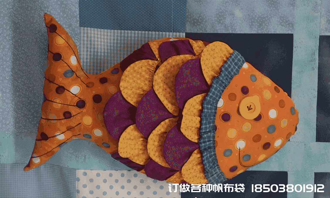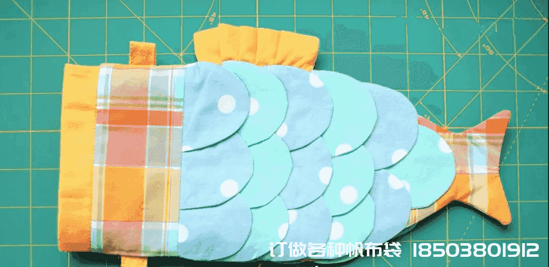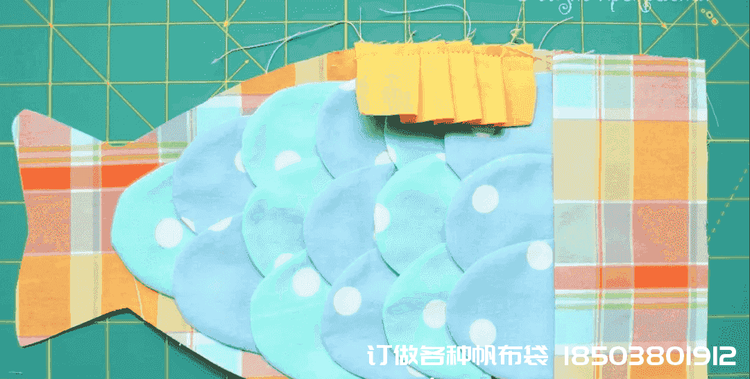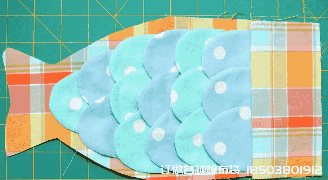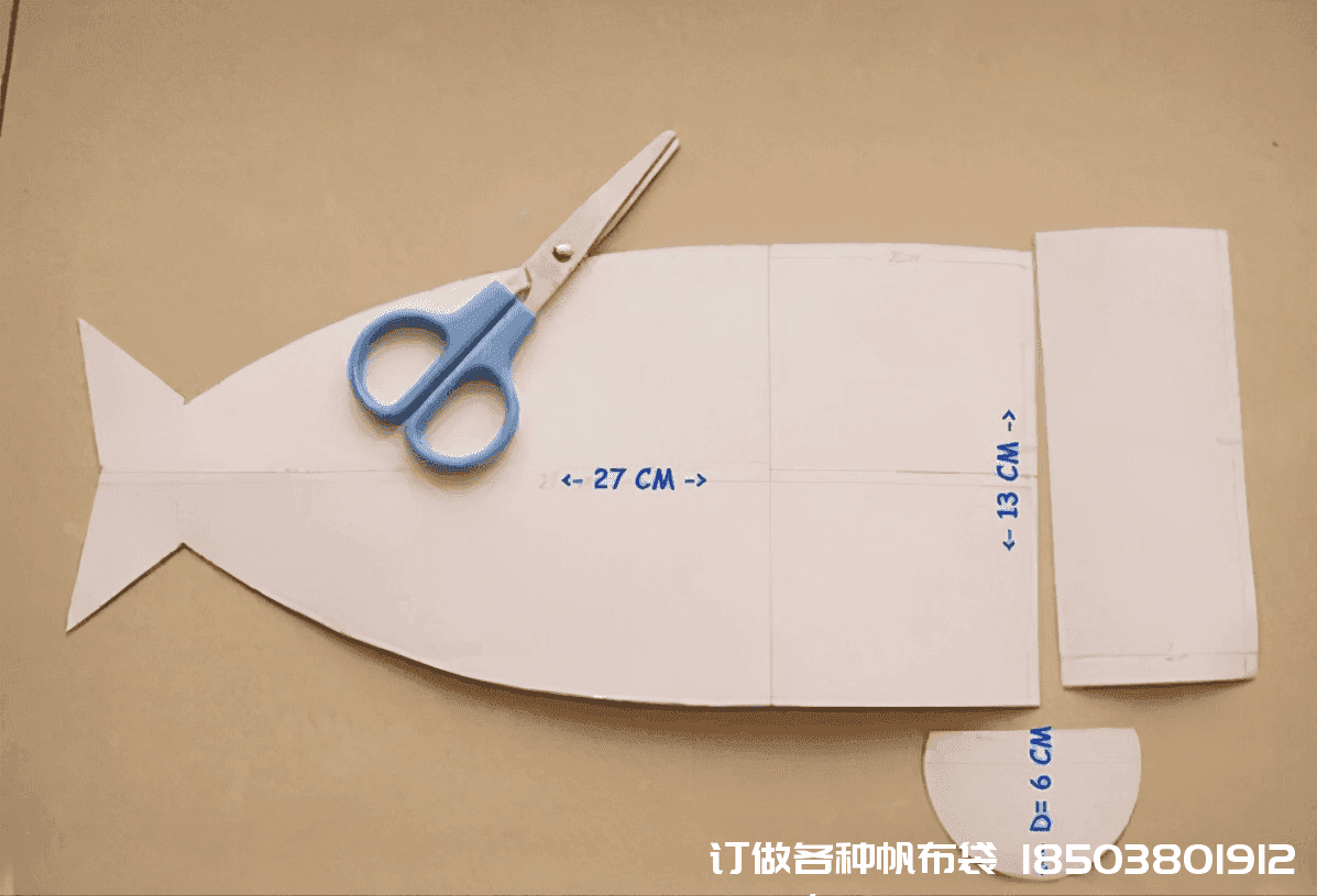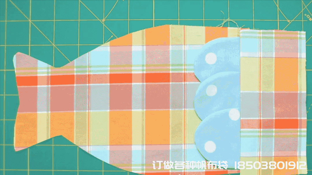 帆布袋制作電話/微信:15838231350把圖紙放在布上畫出,剪兩塊布做魚身,魚頭。
