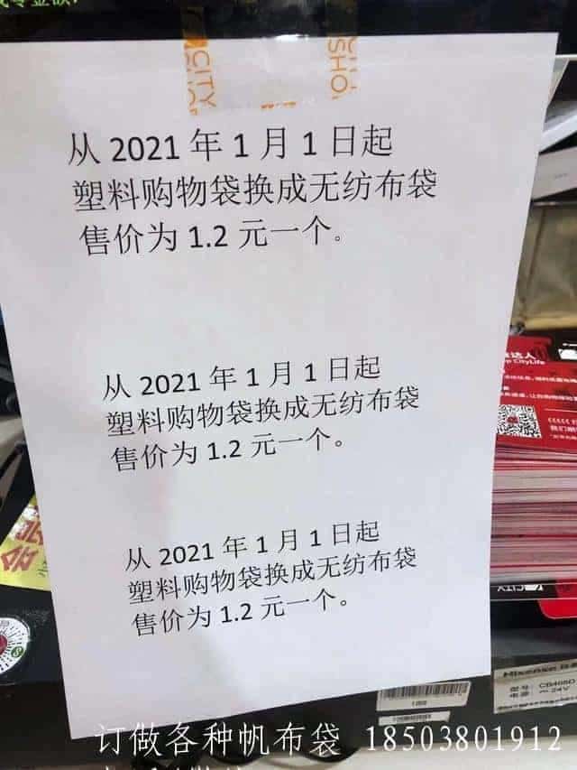 城市超市上海影城店的收銀臺上貼著這樣一張告示:“從2021年1月1日起,塑料購物袋換成無紡布購物袋,售價為1.2元一個。”記者看到收銀臺上正放著一沓無紡布購物袋,規格相當于中等購物袋大小。