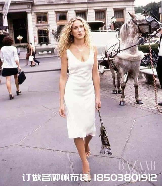 其實早在20年前,《欲望都市》中“行走的種草機”Carrie就已經(jīng)將束口袋配裙拿上了街。而今年正值欲望都市開播20周年,這個經(jīng)典單品因此回潮也是可想而知了。