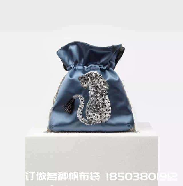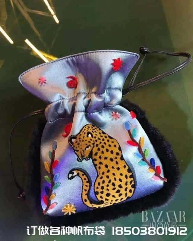 比如在絲緞的束口袋上賦以藍色、粉色等清新的底色,再用刺繡和釘珠勾勒出老虎、斑馬、豹子等動物的形狀。