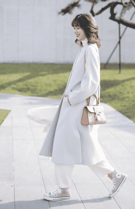 灰色大衣下半身搭配小白褲,白色的闊腿褲很清爽, 和深灰色形成了色彩的對比,再加上帆布鞋搭配起來,看著時髦瀟灑,休閑感十足,基本上不會出錯,日常搭配都是很ok的。