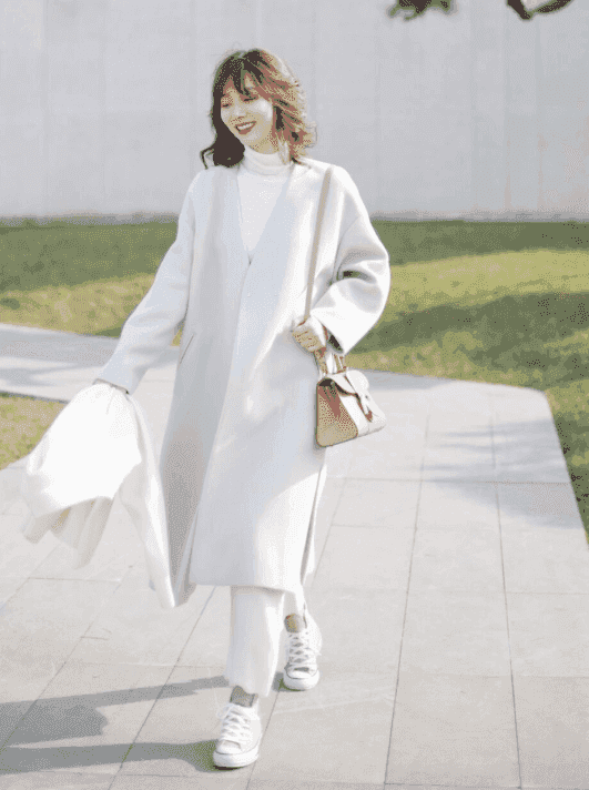 上半身搭配的白色大衣也很溫柔,大衣結合白色的內搭,同色系穿搭很顯氣質,顯白的效果也不錯,下半身搭配的白色九分褲更是能夠和大衣色彩呼應起來,起到顯高的目的。
