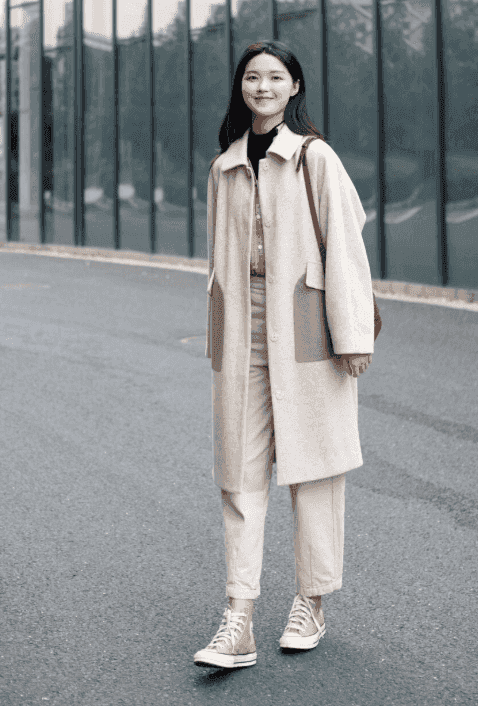 燕麥色的大衣搭配同色系的直筒褲,再加上同色系的帆布鞋修飾,看著并不會顯老,反倒是讓整體的搭配風格呼應起來,簡單大氣,很適合減齡需求強烈的妹妹。