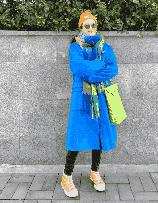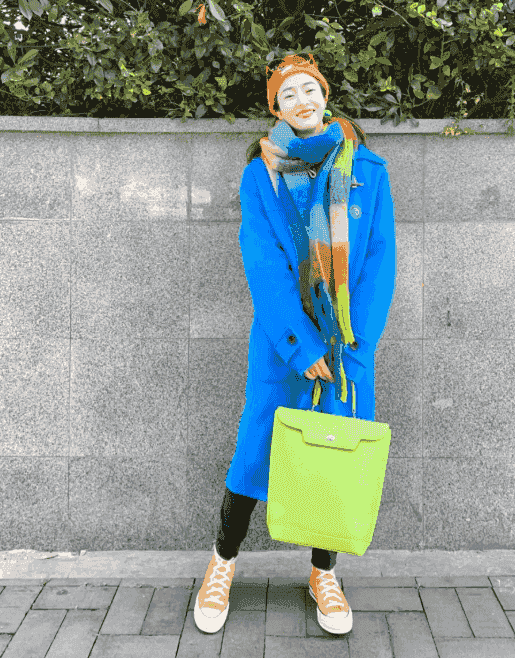黑白灰的帆布鞋都是較為基礎的,百搭耐看,但是針對追求時髦的姐妹來說,亮色系的帆布鞋也是更值得入手的哦。下面的博主選擇黃色帆布鞋,減齡效果十分明顯,搭配藍色的大衣,更是形成了色彩的碰撞, 活力滿滿。