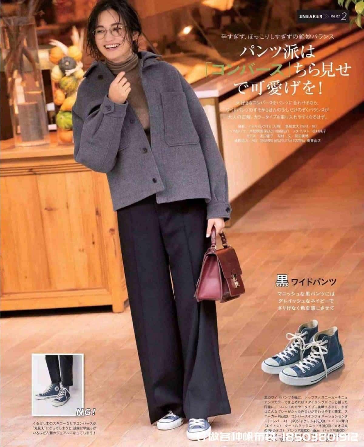 以這款白色帆布鞋為例,可以搭配寬松一點的闊腿長褲,而且褲裝的顏色可以很淺,也可以很鮮艷,完全不具備任何的挑戰性,駕馭這種鞋子最為減齡。