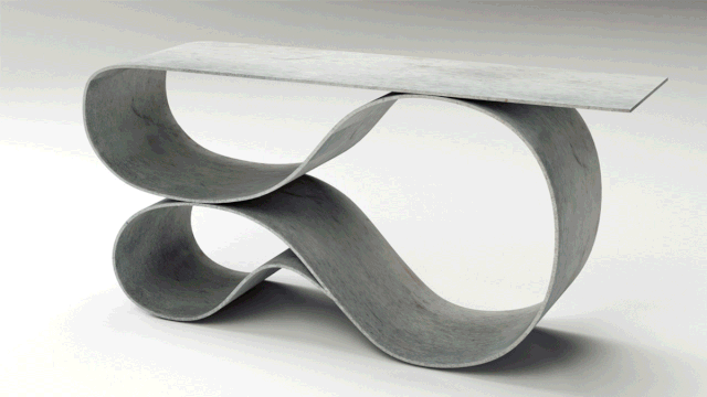 浸透了混凝土的織物在水合作用時(shí)會(huì)變硬,從而形成纖薄、耐用、防水耐火的混凝土層。這種獨(dú)特的鑄造和成型技術(shù)實(shí)現(xiàn)了桌子絕妙的帶狀結(jié)構(gòu)。