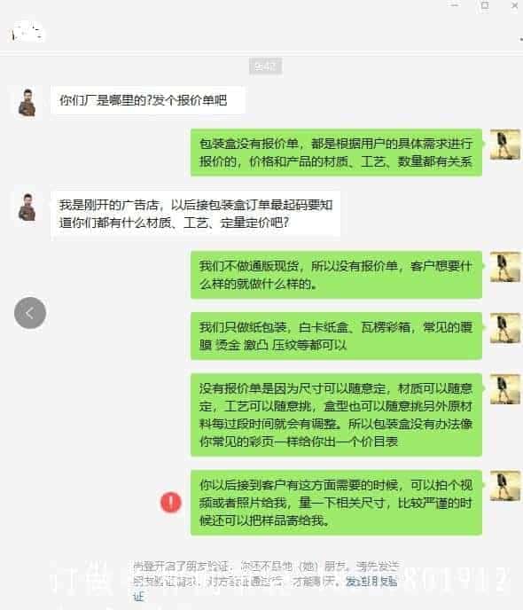 起因為一個剛開廣告店的,找一個做紙箱包裝的要價格表,人家做紙箱的說因為都是定制,規格材質什么的都不一樣,沒有固定的報價單,解釋了一大通之后,被拉黑了